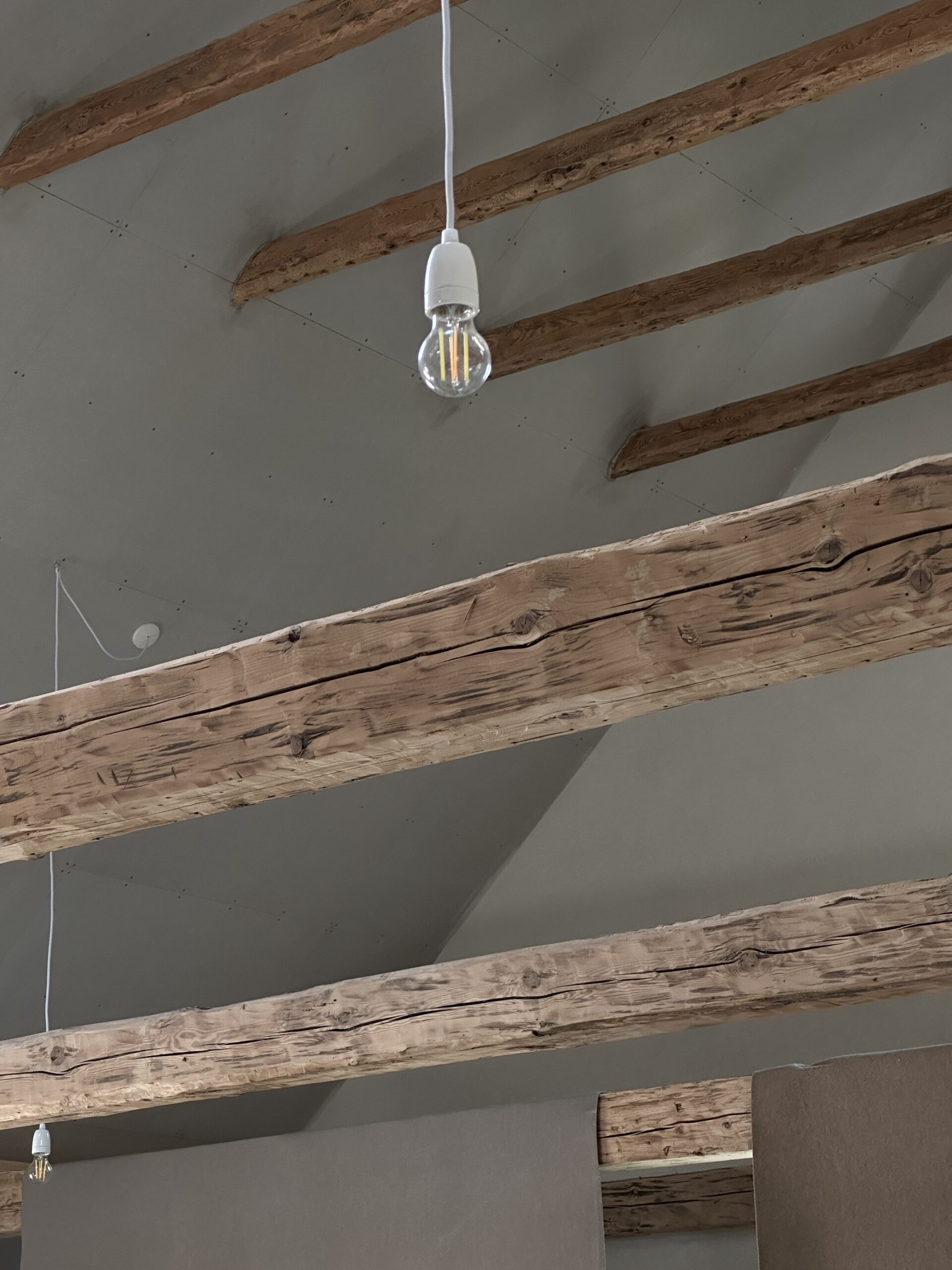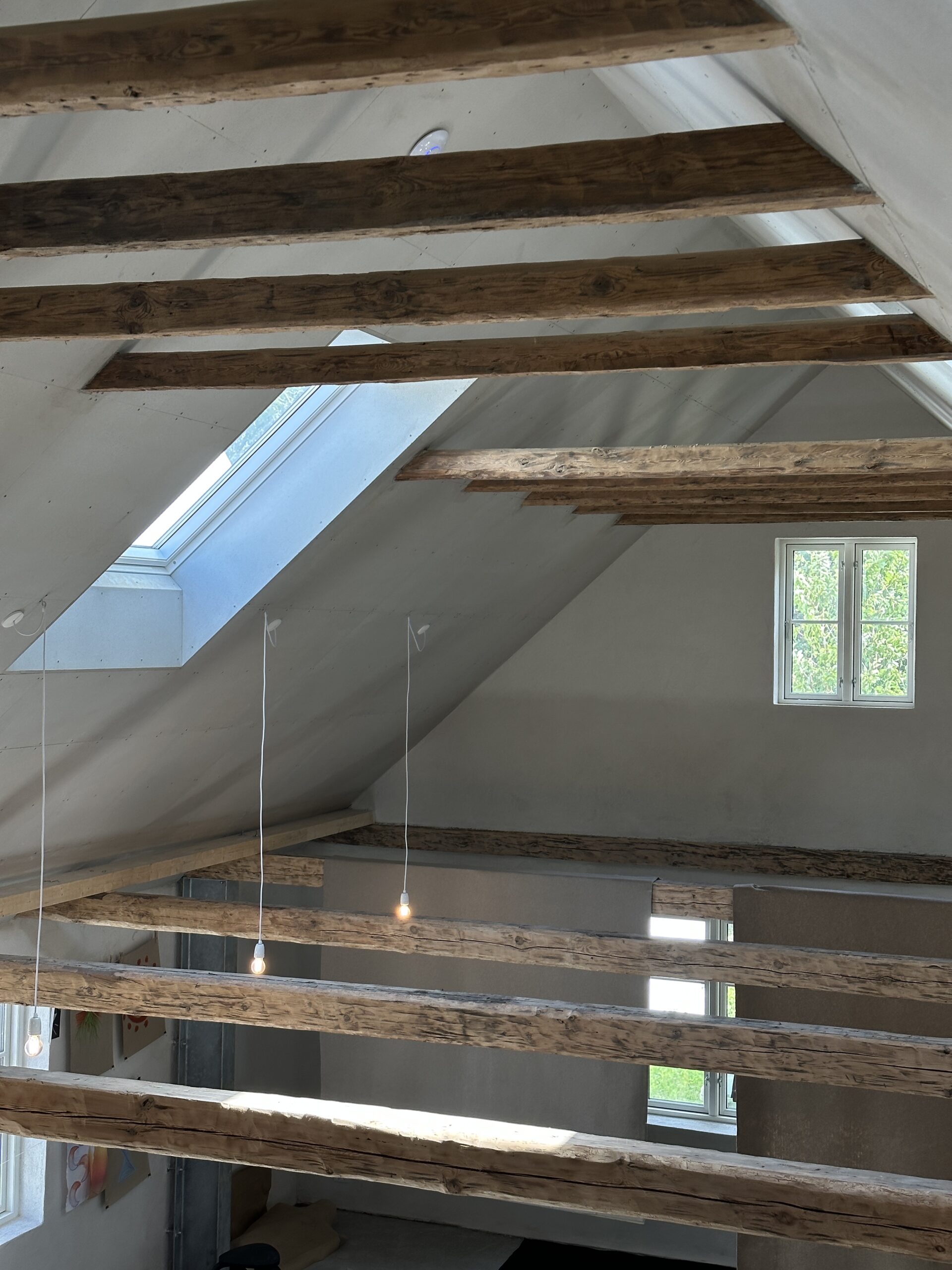 It now has open ceiling, so the old beams are exposed. Added to the beam structure, is steel columns, and the meeting between these appears honest and clean. Two windows added in the ceiling, allows daylight in the space, and the already existing windows are kept for the framed view of the greenery outside. The panels used for the ceiling is ____, and the floor is concrete with epoxy on top.