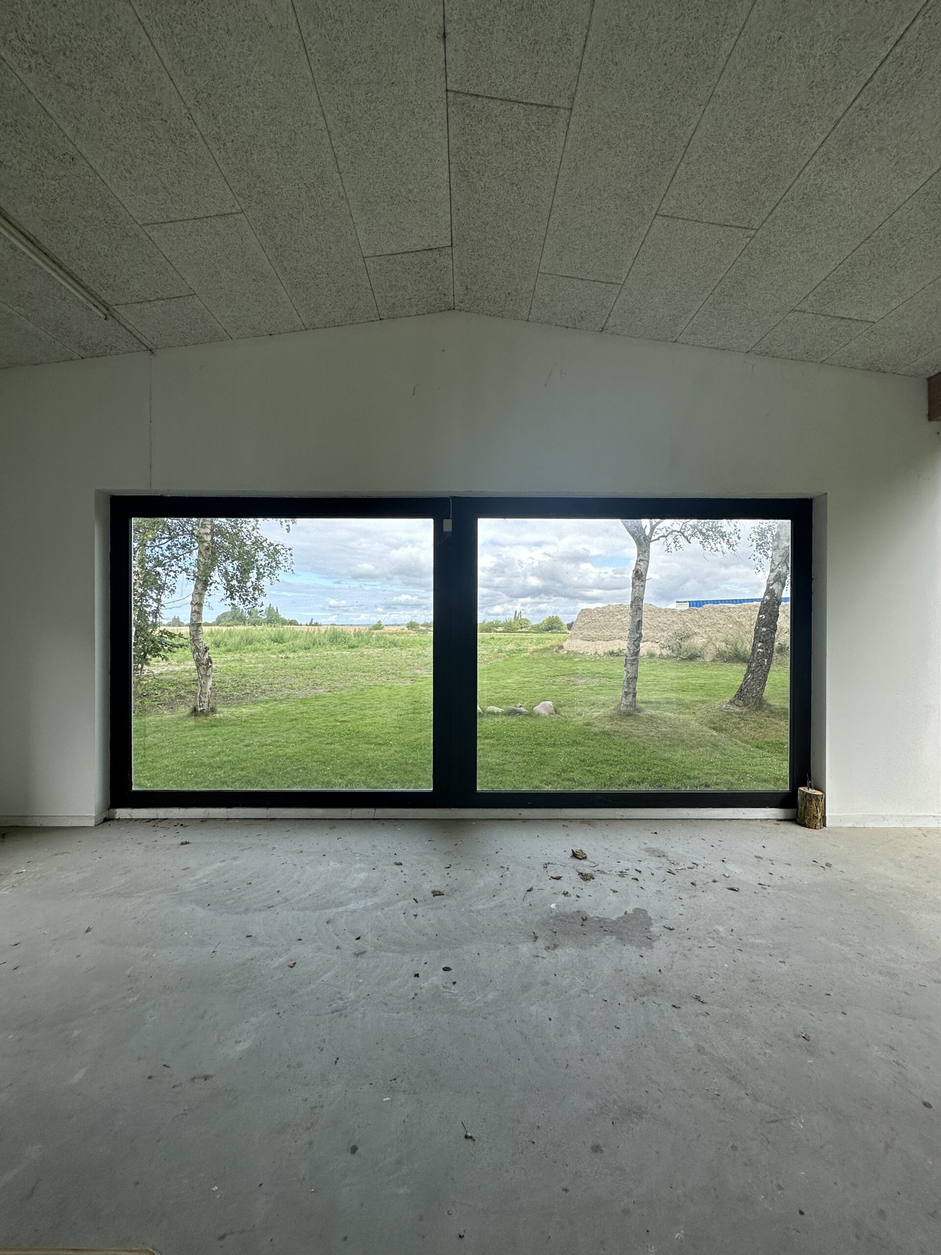 Room 05 is the largest space in the main building. You enter the room from room 02, and it leads to room 04. Besides this, it has double glass doors leading to the terrace. The glass doors allows daylight into the
