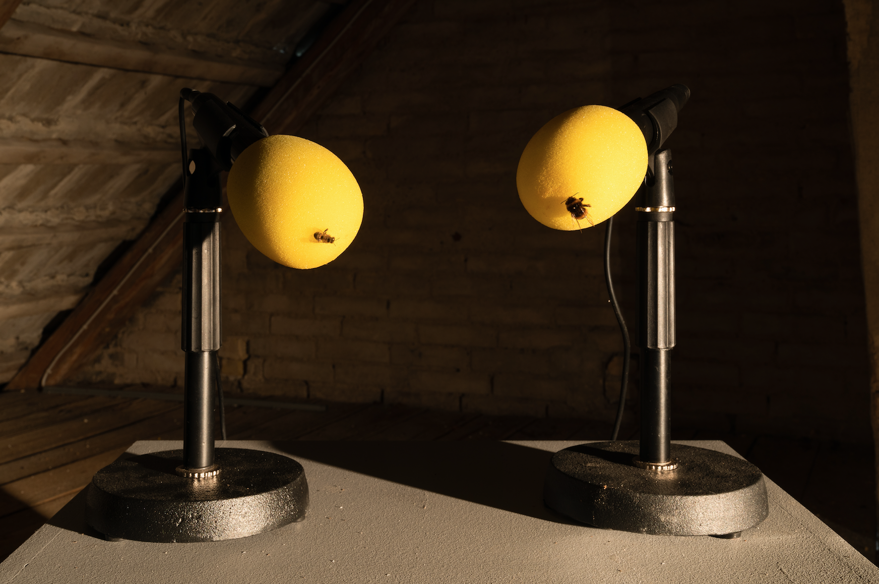 Bergmark exhibition, seemingly a pollinators- friendly environment designed by an interior architect, consist of a number of interior elements often found in the interior décor of institutional contexts. This scenography is constructed as the waiting room of a fictional institution, in a time-pressured culture of high-performance. In such a space, where we are typically simply asked to wait, in a state where decisions are deferred and we are held in a state of limbo, we become the witnesses of an unfolding dialogue between two other waiting entities: a burned-out working-bee from the honey industry in the outskirts of Denmark and a rowdy male bumblebee from Sweden.