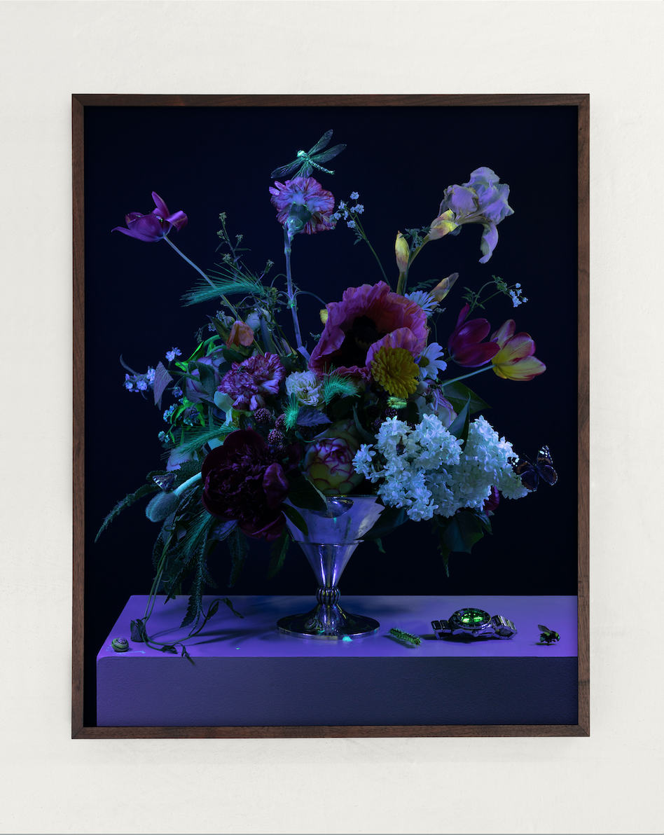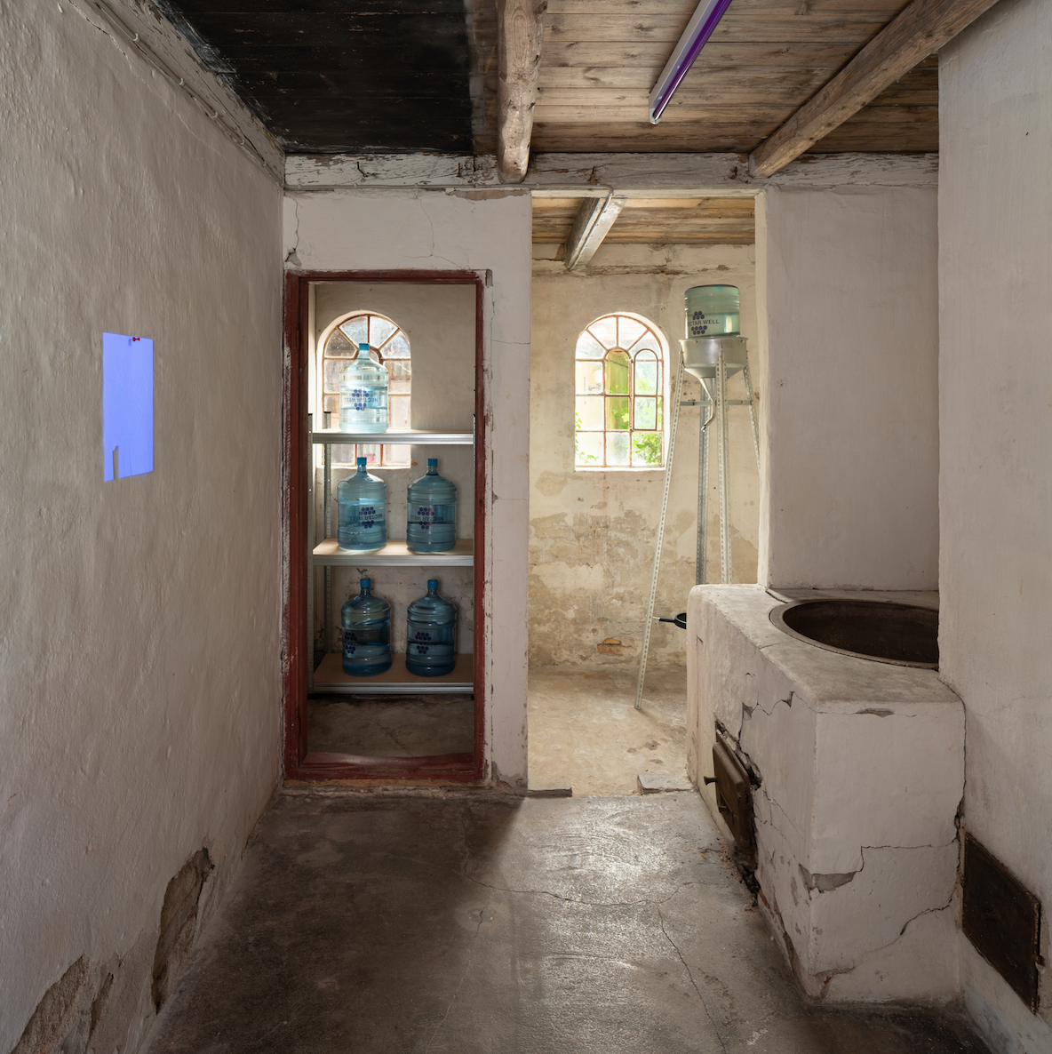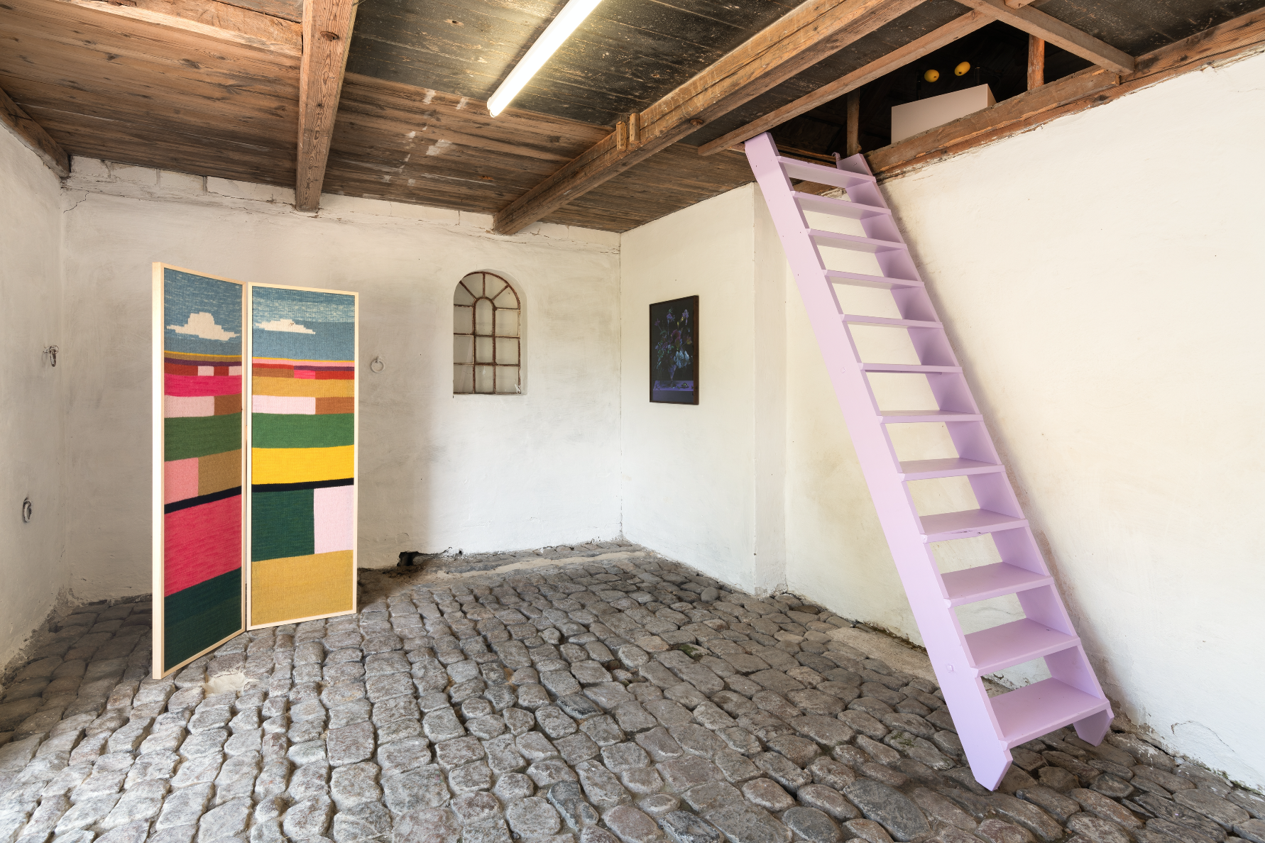 The artist has amplified certain qualities of the objects through the use of elements conceived to meet a “bees-perspective”: a bench with six legs, a woolen room divider with a motif of cultivated fields, a still life with flowers and insects captured in UV light and a drinking fountain containing sugar-water. The sugar water is a recurring element in the exhibition. It refers to a common practice of beekeepers feeding colonies artificially. Bergmark has invited artist Maria Gondek to contribute to the show with the work ‘Nectar Well’ �” offering sugar water to the visitors. In her piece Bergmark draws a parallel between human working conditions within the capitalistic system of production and the unpaid work that bees perform pollinating crops and producing honey within the same economic system.