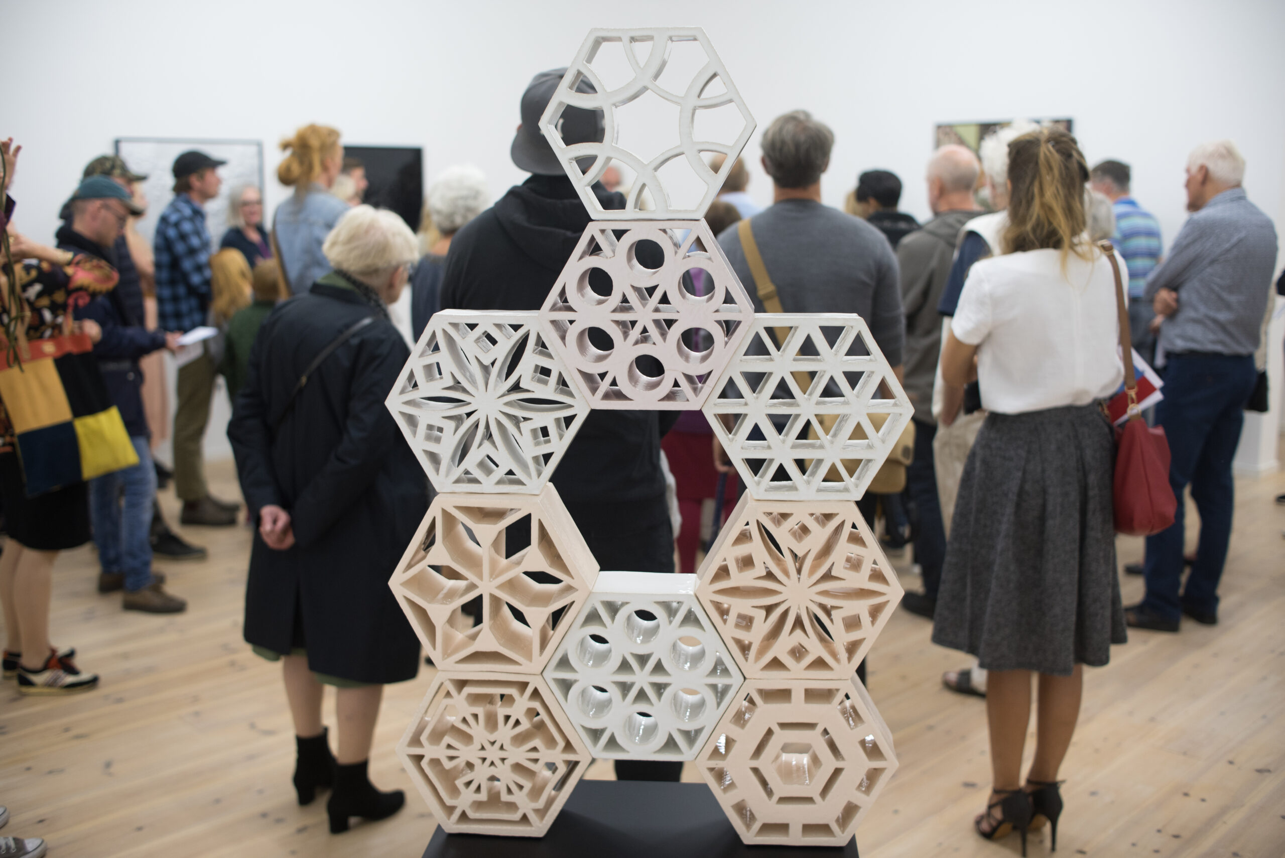 Nevin Aladağ vil vise det komplekse værk “Social Fabric” (2017/18). Her har kunstneren samlet tæpper af forskellig oprindelse og fra forskellige produktionsbetingelser ” fra knyttede kelim, uld- og silketæpper til industrielt fremstillede Tretford og sisaltæpper. Disse patchwork-lignende stoffer skaber krystallinske mønstre, der minder om kirkers farverige glasvinduer og kombinerer elementer fra forskellige kulturer og perioder ” fra den islamiske kunsts abstrakte ornamentik til modernistiske strømninger såsom kubisme og Bauhaus. Aladağ vil også vise et sæt af sine “Jali Sculptures” (2018), der er sammensat af transparente tredimensionale fliser, som ligner dem, der bruges i sydlige kulturer som dekorative arkitektoniske elementer til vægge og vinduer. Aladağ har specialfremstillet fliserne i keramisk glaserede pastelfarver og fusionerer forskellige historiske stilarter i geometriske mønstre.