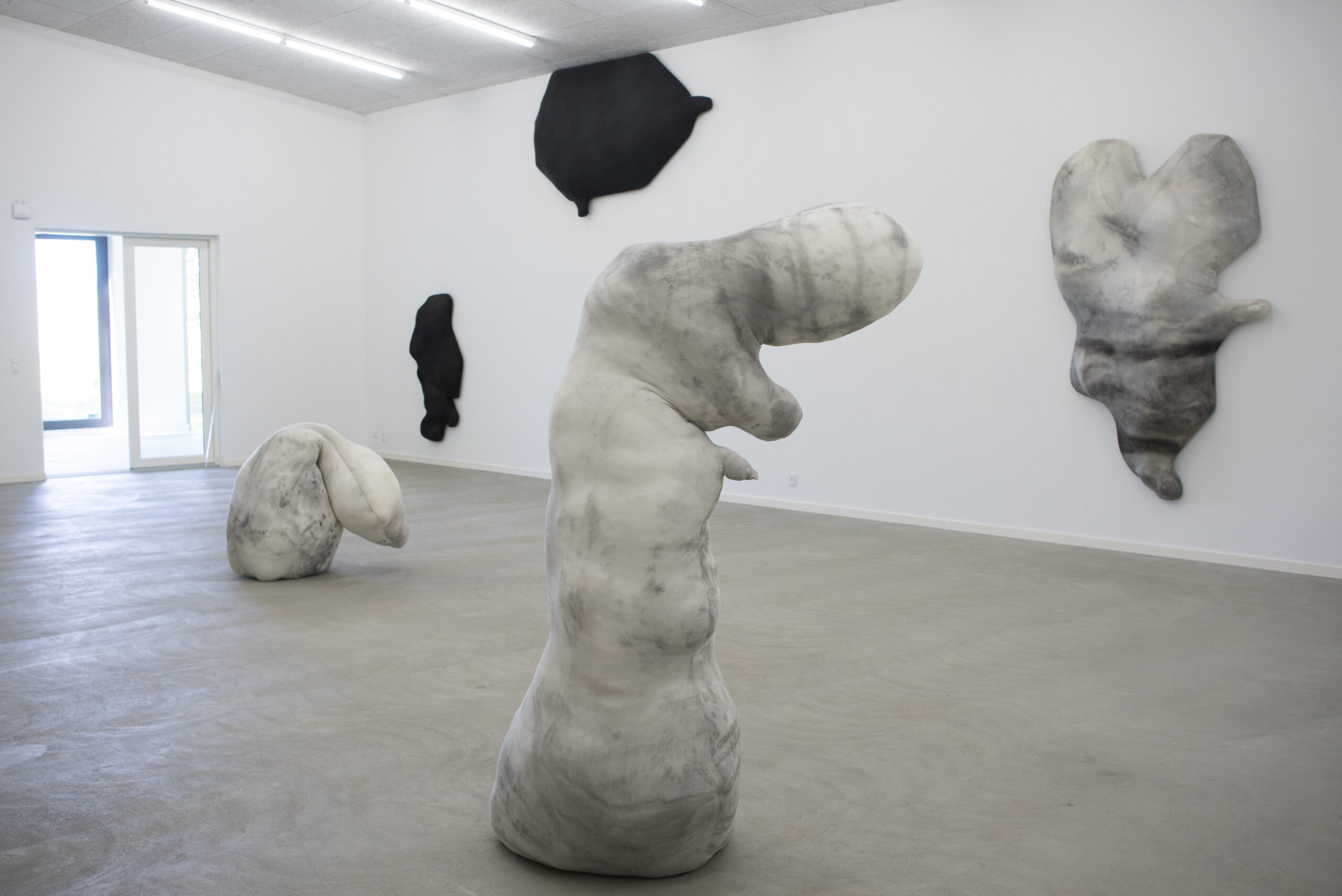 I den store hal viser Dorothee Diebold sine seneste “Volumen Malerier” (2018/2019). Disse hybrider mellem staffelimaleri og skulptur spreder sig ud over deres rammer og ind i rummet som deformerede legemsdele, svampe eller skyer. Deres amorfe former vokser bogstaveligt talt ud af de flydende strukturer, som udfolder sig på det bløde stof. Gennem behandling med blæk, akrylmaling og vand skaber Diebold kosmiske sfærer af glitter og forskellige gråtoner ” strukturer hvor blikket skifter mellem at se som i et mikroskop og ud i universets storhed. Ved at tage ideen om det formede lærred til et andet niveau bryder Diebold radikalt den firkantede træramme op i tredimensionale former for yderligere at udstoppe det elastiske lærred (faktisk jerseylagner) med polstring. Disse semi-bløde former er måske fastgjort til væggene som traditionelle lærreder, de står måske på gulvet som skulpturer” men de modstår traditionelle kunsthistoriske kategorier. Med deres gråtonede skygger og flydende former minder de også om dynger af snavset sne, som langsomt kunne forsvinde eller vokse yderligere som svampe. På trods af denne hemmelighedsfulde aura får det fine glitterstøv dem til at se dyrebare og indbydende ud” og efterlader os lidt usikre på, hvordan vi skal nærmer os.