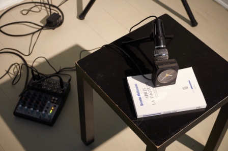 Quartz is the mineral of which sand for the most part consists. In the next room we encounter a quartz clock whose ticking is amplified by a microphone. One property of the mineral quartz is that the duration of its electric oscillations precisely match the duration of our seconds, which is why it is suitable as the timekeeper in the quartz clock. But if we listen very carefully, we hear that not every second sounds the same, and that every minute there are cycles to be discovered which recur, but never exactly the same way. A book by the philosopher Quentin Meillassoux, Après la finitude, serves as the base of the clock, as if hearing is being supporting by thinking.