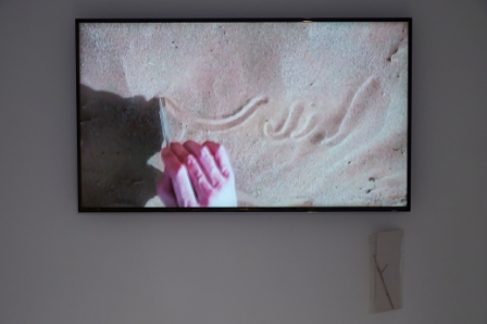A video screen forms the concluding aspect at the end of the space; we have heard its sound the whole time, but only in coming closer do we identify it as a sandstorm.