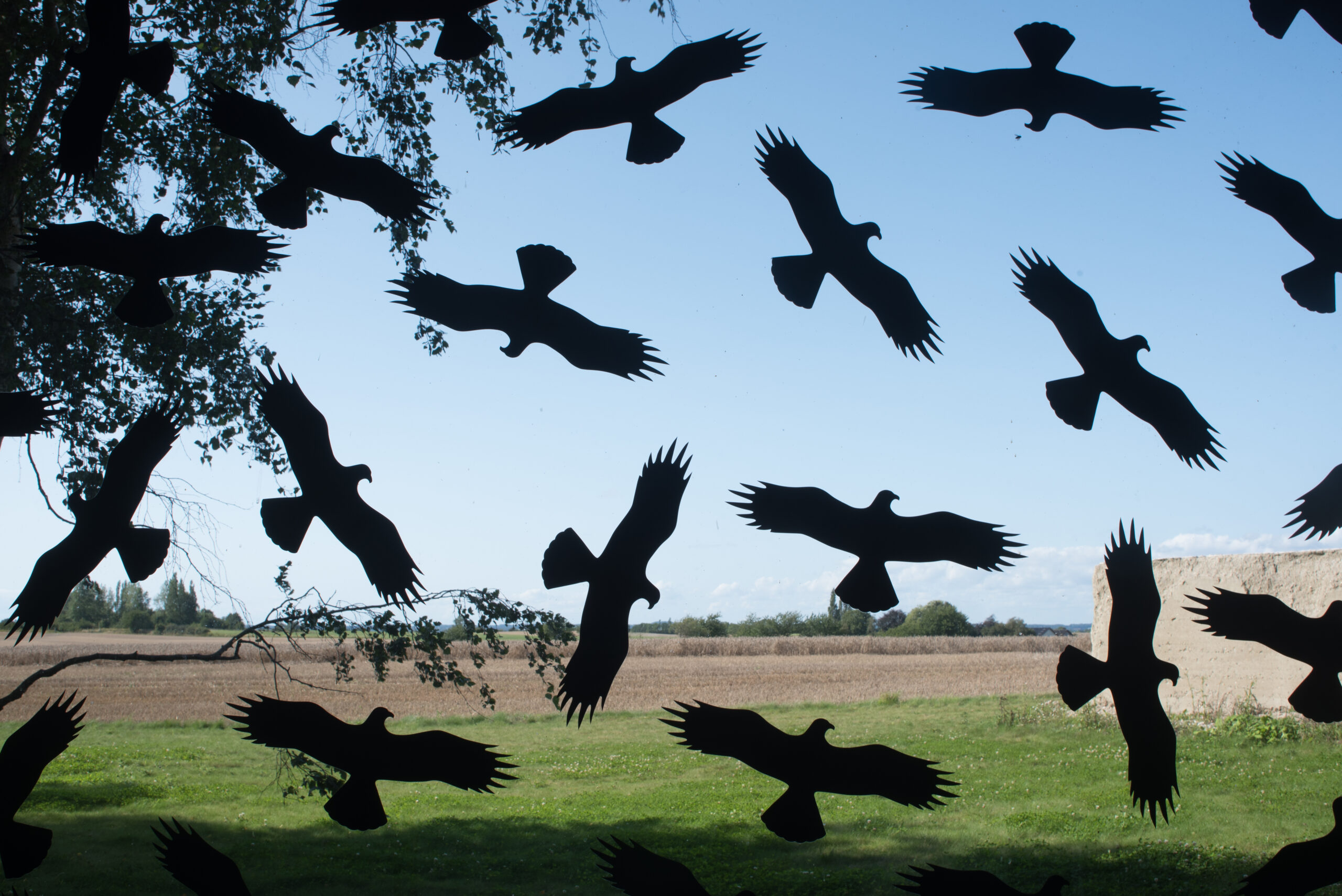 I udstillingens første rum udsender en sort husholdsningsspand lyden af dryppende vand men “lydeffektens” naturlighed bliver bevidst kompromitteret, idet CD-afspiller, højtalere og elektriske ledninger er fuldt synlige for beskueren (Bucket, 1999). ‘Drill’ (2006) presser vendingen ‘lukket kredsløb’ ad absurdum: et bor ligger på gulvet, og dets ledning er forbundet til to huller, som tidligere er blevet boret i væggen omtrentligt i den højde, hvor man sædvanligvis kunne forvente at finde en stikkontakt. Domino Effect (2015) er en skulpturel installation, der fremstiller øjeblikket umiddelbart inden den omtalte ‘effekt’ indtræffer: en række af domino-sten står klar til at performe værkets titel i det øjeblik, en af stenene bliver ramt af en fod eller skubbet omkuld af træk fra en dør eller et vindue. ‘Rock Paper Scissors’ (2013) er en serie bestående af 3 fotografier, som fremstiller de genstande, der indgår i den berømte leg. En væg er fuldstændigt dækket med sort og gul afspærringstape. Tapen er klistret diagonalt på væggen, hvilket resulterer i, at de diagonale striber bliver til horisontale linjer ” en visuel effekt, der transformerer advarslen og gør den abstrakt (Wall, 2002). Ved siden af den ‘afspærrede væg’ ses ti 10%-klistermærker” klistermærker af den slags, der normalt anvendes i supermarkeder til at indikere, at en vare er nedsat. Her giver klistermærkerne tilsammen 100%, hvilket også er værkets titel (2012). I lydværket ‘Goldberg Variation’ (2002) bliver værktitlen brugt som en rammesætning, der bestemmer værkets identitet og betydning. ‘Goldbergvariationerne’, oprindeligt komponeret til cembalo af Bach, er en barok klaviaturøvelse omhandlende musikalsk struktur. Det er siden blevet et hovedværk i den klassiske musikkanon, og det består af 30 variationer over en enkelt aria. Floyer bruger det oprindelige værk som sit udgangspunkt, men hun præsenterer simultant alle de forskellige optagelser og fortolkninger, hun har kunnet opstøve. Kondenseringen af de forskellige, individuelle udgaver ned i én sammensat version anerkender og artikulerer spøgefuldt originalens konceptuelle udgangspunkt. Værket ‘Warning Birds’ (2002) afslutter udstillingen og er en samling af sorte fugleklistermærker, der er monteret på det store vindue, som er placeret bagerst i kunsthallen. De sorte fugle” normalt brugt med henblik på at skræmme andre fugle væk” udgør tilsammen en tæt flok, som næsten blokerer udsigten ud til det pittoreske landskab, der grænser op til 44Møen.