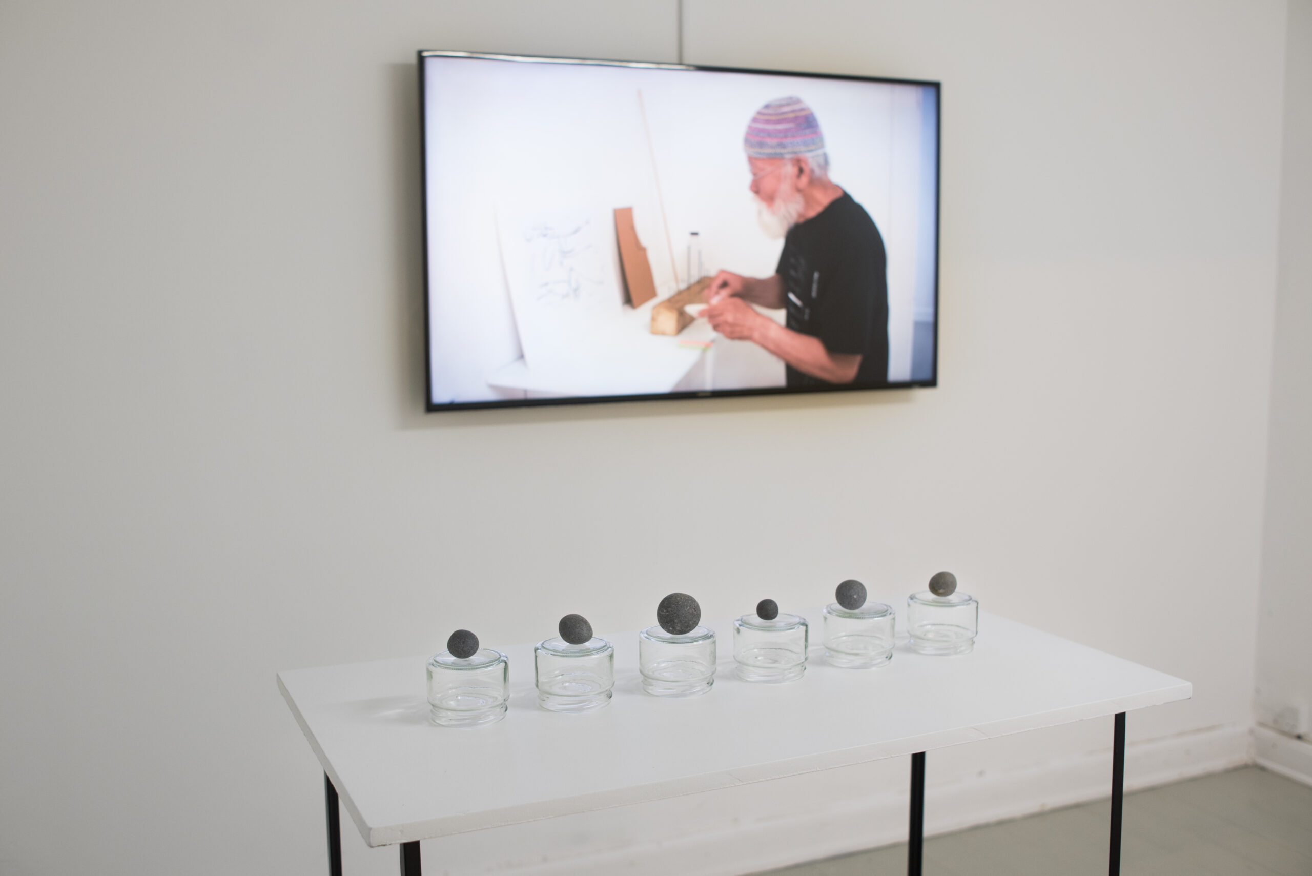 Da vi vaskede udstillingens sten rene for jord sagde Suzuki: “Happy stone” og brød ud i latter.